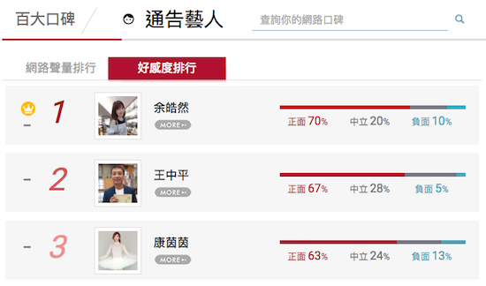 另外,好感度第三名的ㄦ字腰女神「康茵茵」,精湛舞技在演藝圈享譽盛名,加上她喜愛旅遊,蹤跡遍佈全台,於是先前以優雅的高難度舞姿,在各地知名景點留下美麗倩影,推出一系列「用身體記錄台灣」的美照,大獲網友好評,節目邀約如雪片飛來,媒體也爭先報導。由此可見,話題絕對是通告藝人提升自我價值的重要因素,也是爭取螢幕曝光的不變定律。
