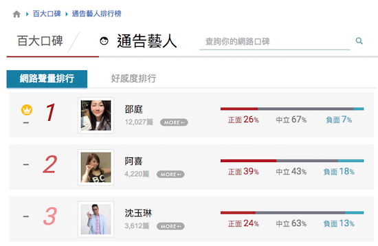 而這些療癒身心的「通告藝人」,無疑是台灣民眾生活中的調劑品,他們或許不是天王天后,也沒有大紅大紫,但是從地方媽媽到雲端網友可能都會愛他/她。因此,為了找尋網友心中不可或缺的「通告藝人」,並且向他們致敬,網路溫度計這回就透過大數據科技,針對2016年9月15日至2017年3月13日網友在臉書討論度,與各大新聞媒體、討論區的留言進行分析,為你整理出「百大口碑」通告藝人排行榜,讓這些為生活帶來歡笑淚水的「通告藝人」以不同方式活躍於網路上。