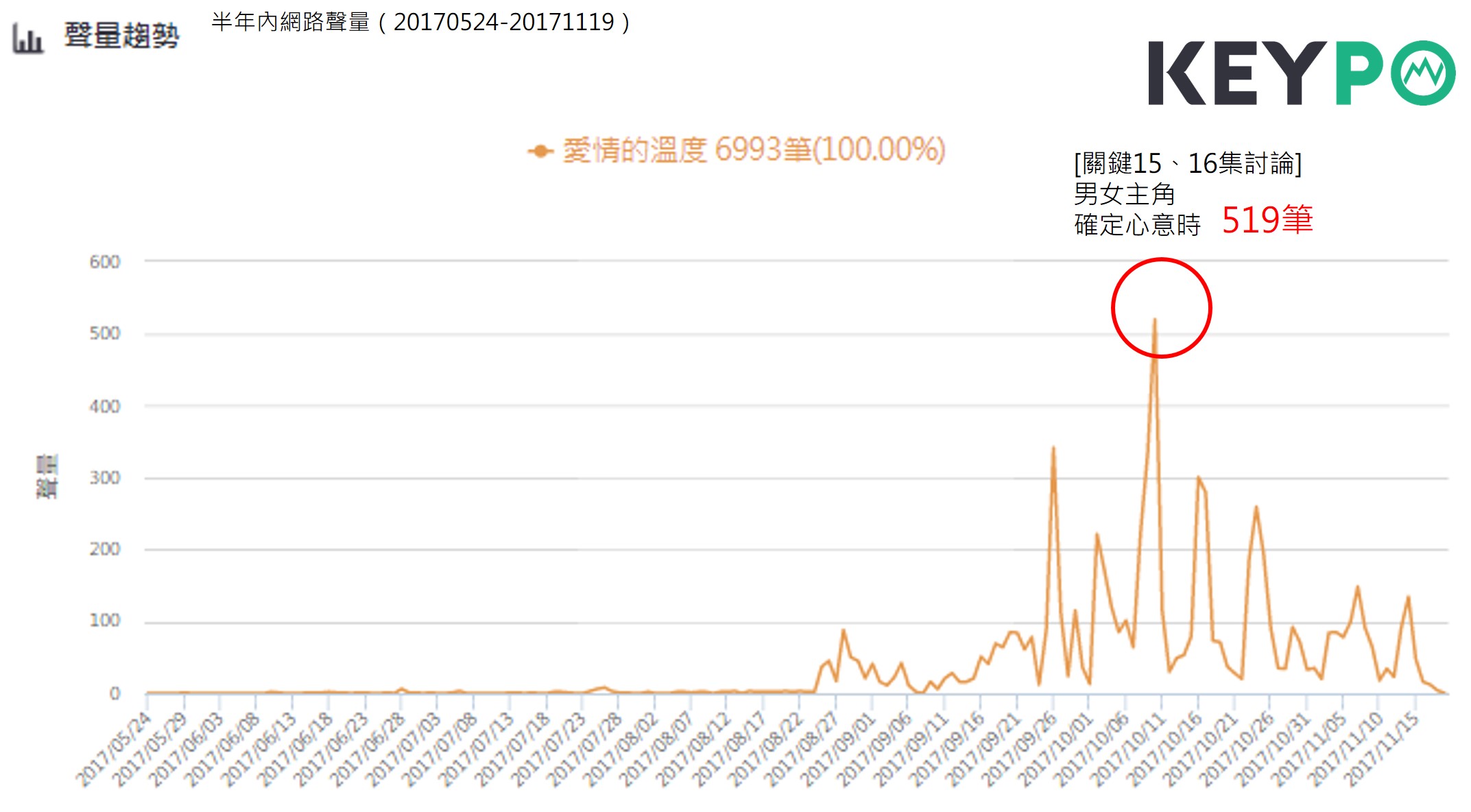 「愛情的溫度」半年討論聲量趨勢,一共6993筆討論數,亦可看出網友關注熱度最高落在關鍵認愛劇碼。