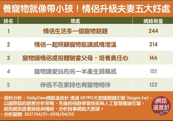 因此,DailyView網路溫度計今日特別透過《KEYPO大數據關鍵引擎》調查,告訴你情侶升格成寵物爸媽會碰上哪些好、壞處,讓你在衝動前多一篇閱讀文章的時間仔細想清楚!