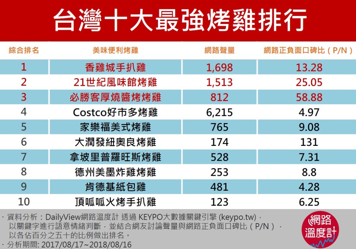 今日DailyView網路溫度計透過《KEYPO大數據關鍵引擎》從2017年8月17日到2018年8月16日間觀察網友在臉書討論、PTT與各新聞媒體、討論區的留言,統整出「全台十大美味便利烤雞」排名,快來看看你有沒有都吃過了!