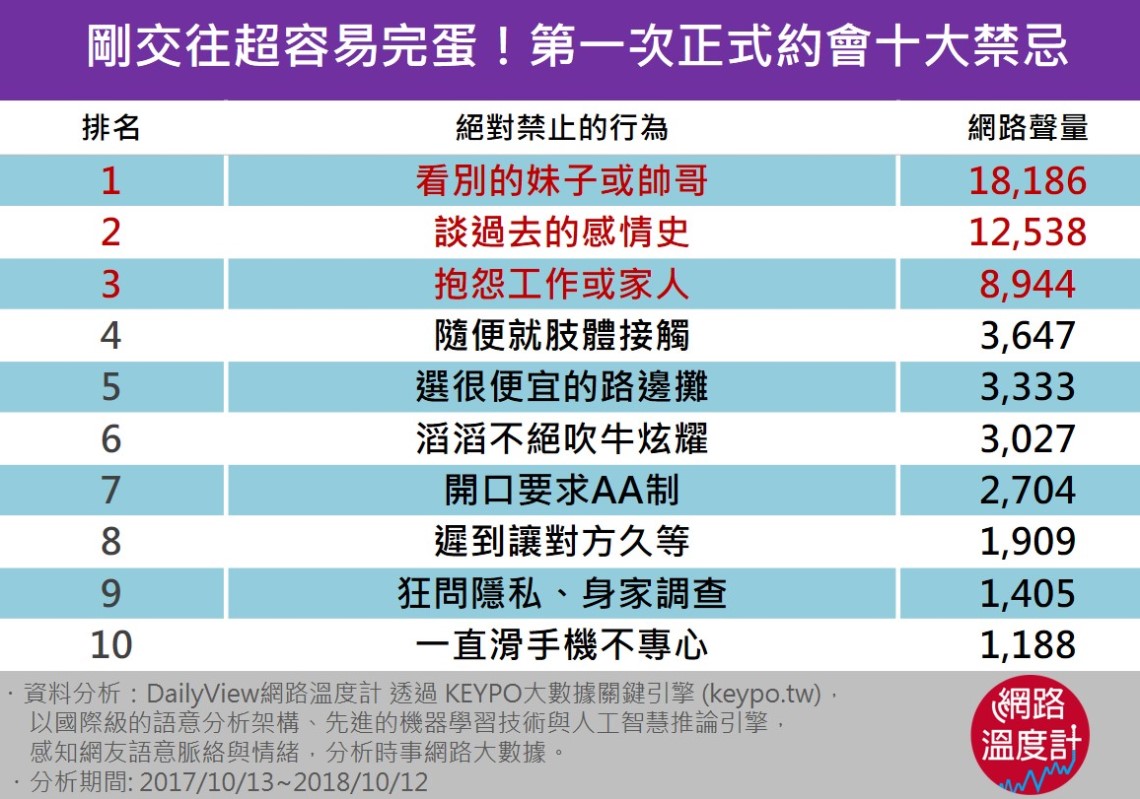 今日DailyView網路溫度計透過《KEYPO大數據關鍵引擎》從2017年10月13日到2018年10月12日一年間觀察網友在臉書討論、PTT與各新聞媒體、討論區,統整出「交往後第一次約會禁忌」排名,讓你/妳約會不踩雷,幸福到永遠!