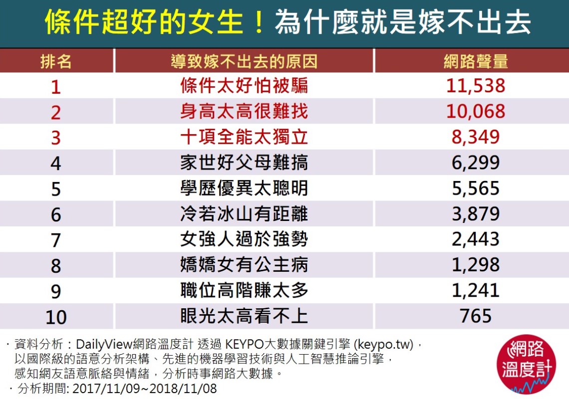 今日DailyView網路溫度計透過《KEYPO大數據關鍵引擎》來看看這些條件超好的女生們嫁不出去的原因吧!