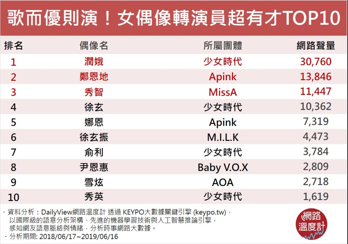 今天網路溫度計就透過《KEYPO大數據關鍵引擎》調查,這幾年轉演員的男女團偶像愛豆中分別最有人氣的TOP10,有的人讓你意想不到、有的人戲約不斷,隨著更多新血演員加入,最開心的莫過於粉絲,因為又有更多好戲可以看啦!