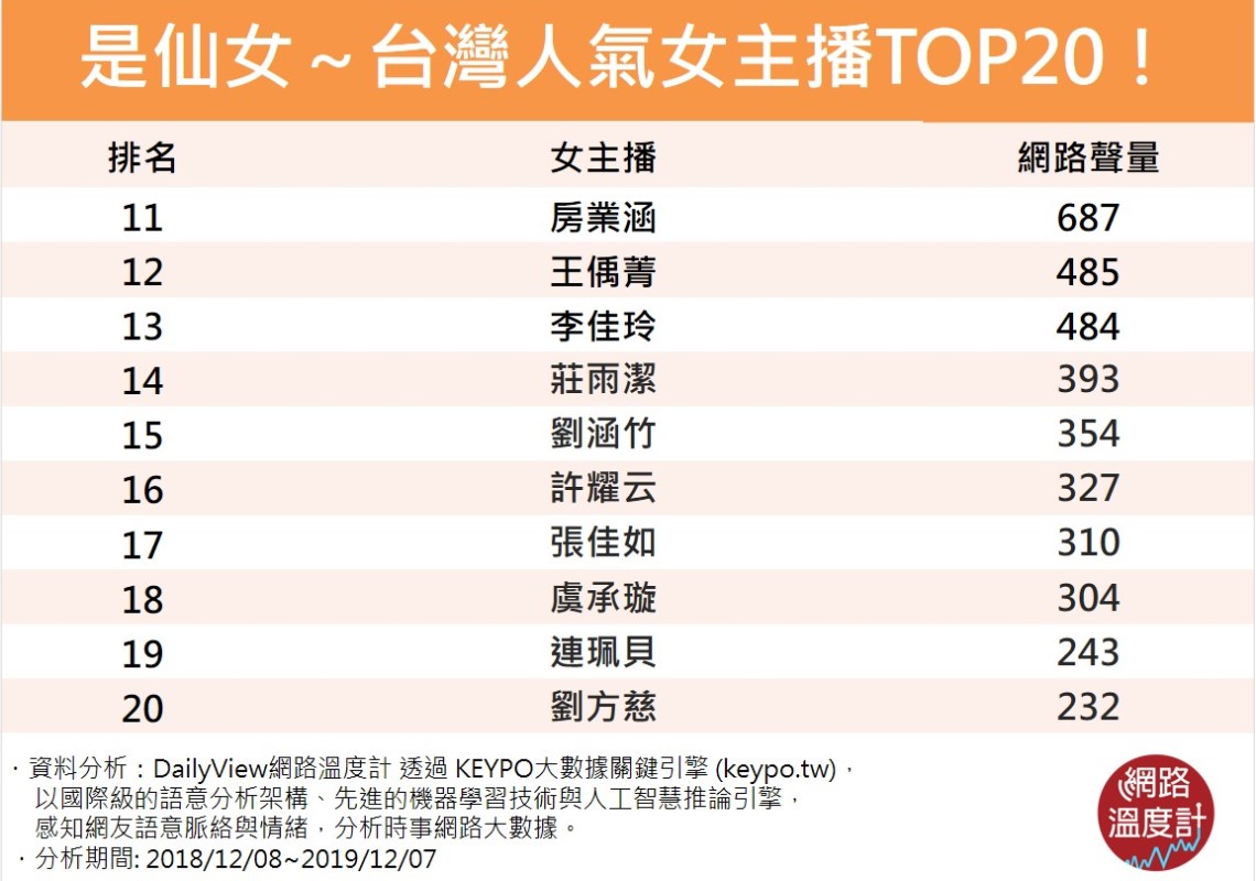 因此今天DailyView網路溫度計透過《KEYPO大數據關鍵引擎》調查台灣各電視台當家、當紅女主播,不僅各個是PTT表特版常客,更有許多有星家人、明星臉,快來看看你喜歡的她有沒有上榜!