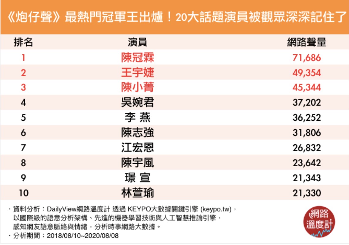 今天的《DailyView網路溫度計》就透過《KEYPO大數據關鍵引擎》告訴你,《炮仔聲》大陣仗的劇組裡,被網友討論的演員中,無論正派反派,誰的討論度最高~他們又各自飾演了什麼樣厲害的角色呢?