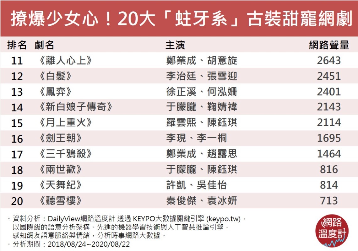 今天DailyView網路溫度計就透過《KEYPO大數據關鍵引擎》調查,2019、2020短短2年間,甜到膩歪、又讓人忍不住一看再看的大陸古裝甜寵網路劇有哪些?