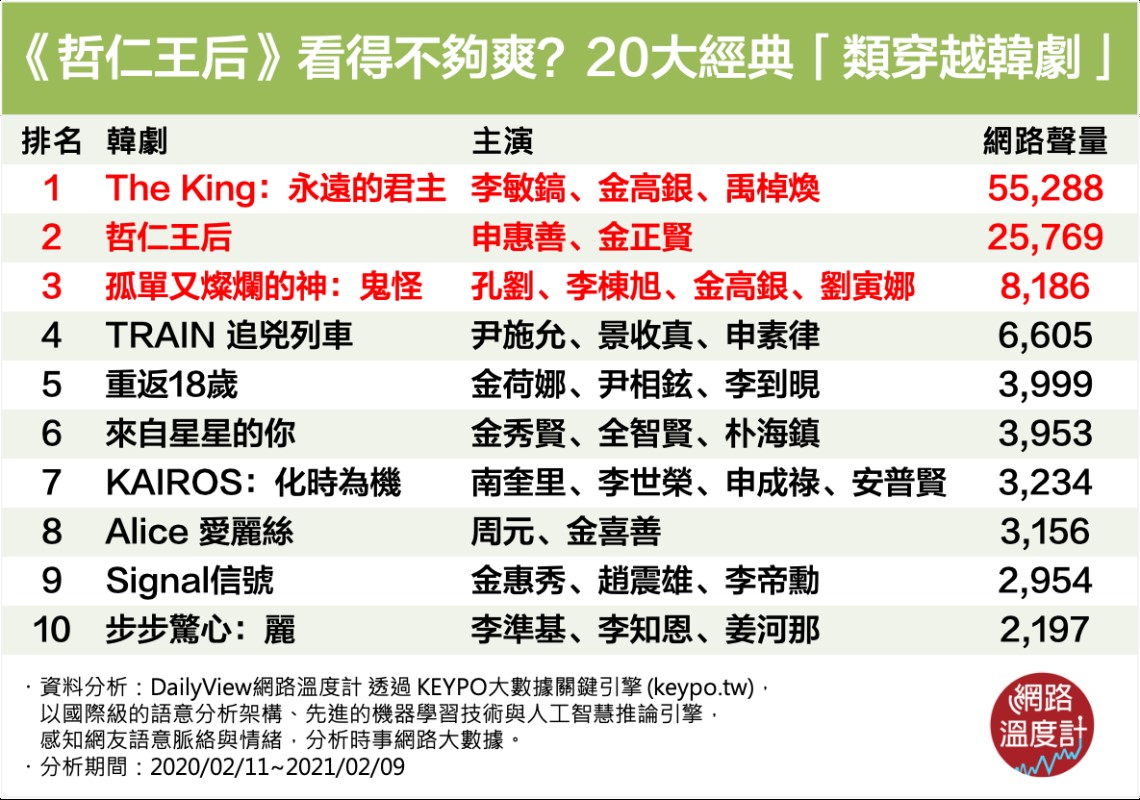 今天DailyView網路溫度計就透過《KEYPO大數據關鍵引擎》調查,統整出大家討論度最高、最推薦的20大類穿越劇,看膩了粉紅泡泡甜寵或清新校園劇,想活動活動一下大腦的人,趕緊收進待看名單裡,趁著假期好好追一波!