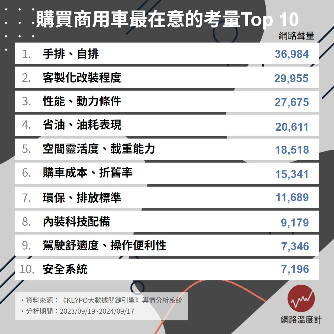 與購買私人轎車不同,選購商用車更重視實際效益,如車輛的耐用性、油耗表現、維修保養成本及承載能力等。畢竟,商用車的每一分表現,都關係到實質收益與生意運作。《網路溫度計DailyView》透過《KEYPO大數據關鍵引擎》輿情分析系統,調查網路上關於購買商用車時最在意的十大考量條件。無論你是尋找新車的老闆,還是想更換車輛的業者,歡迎收藏這份排名文,其中的關鍵考量要素,說不定能幫助你提升業務表現。