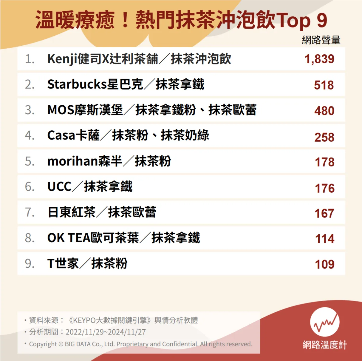 為了滿足抹茶控的期待,《網路溫度計DailyView》透過《KEYPO大數據關鍵引擎》輿情分析軟體,調查了市面上琳瑯滿目的熱門抹茶沖泡飲,以高品質與便利性風靡市場,沖泡方式簡單方便,只需加入熱水攪拌,就能獲得一杯香濃美味的抹茶飲,無論是早晨提神、午後放鬆,或是夜晚窩在沙發上細細品味,都非常溫暖與幸福。