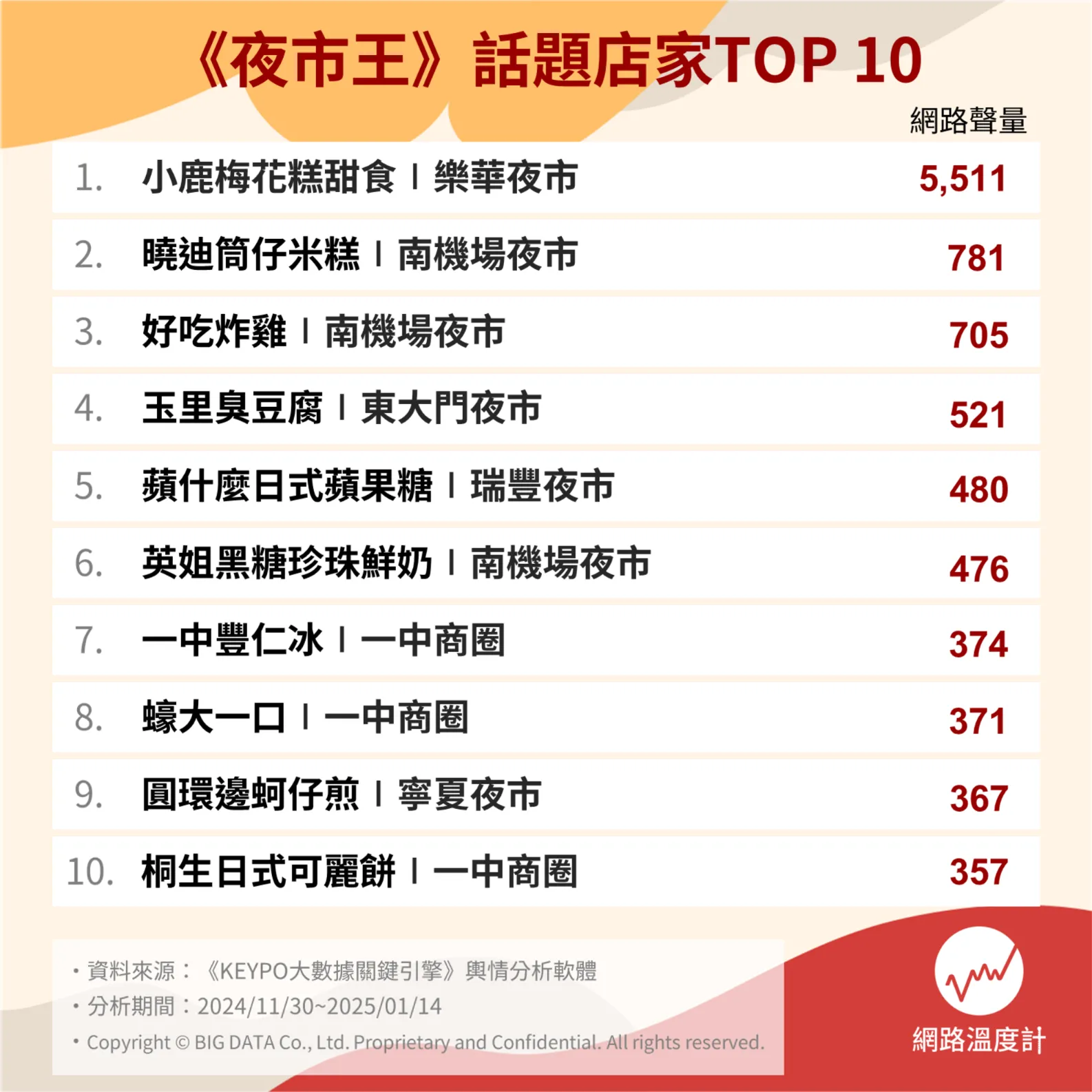 這場《夜市王》最終爭霸戰未演先轟動,精采交鋒前夕,《網路溫度計DailyView》透過《KEYPO大數據關鍵引擎》輿情分析軟體,找出前9集60間參賽店家當中最具話題的TOP 10,一併附上店家情報給大家。好戲上演之前,不妨先跟著我們一嚐節目中出現的夜市美味吧!