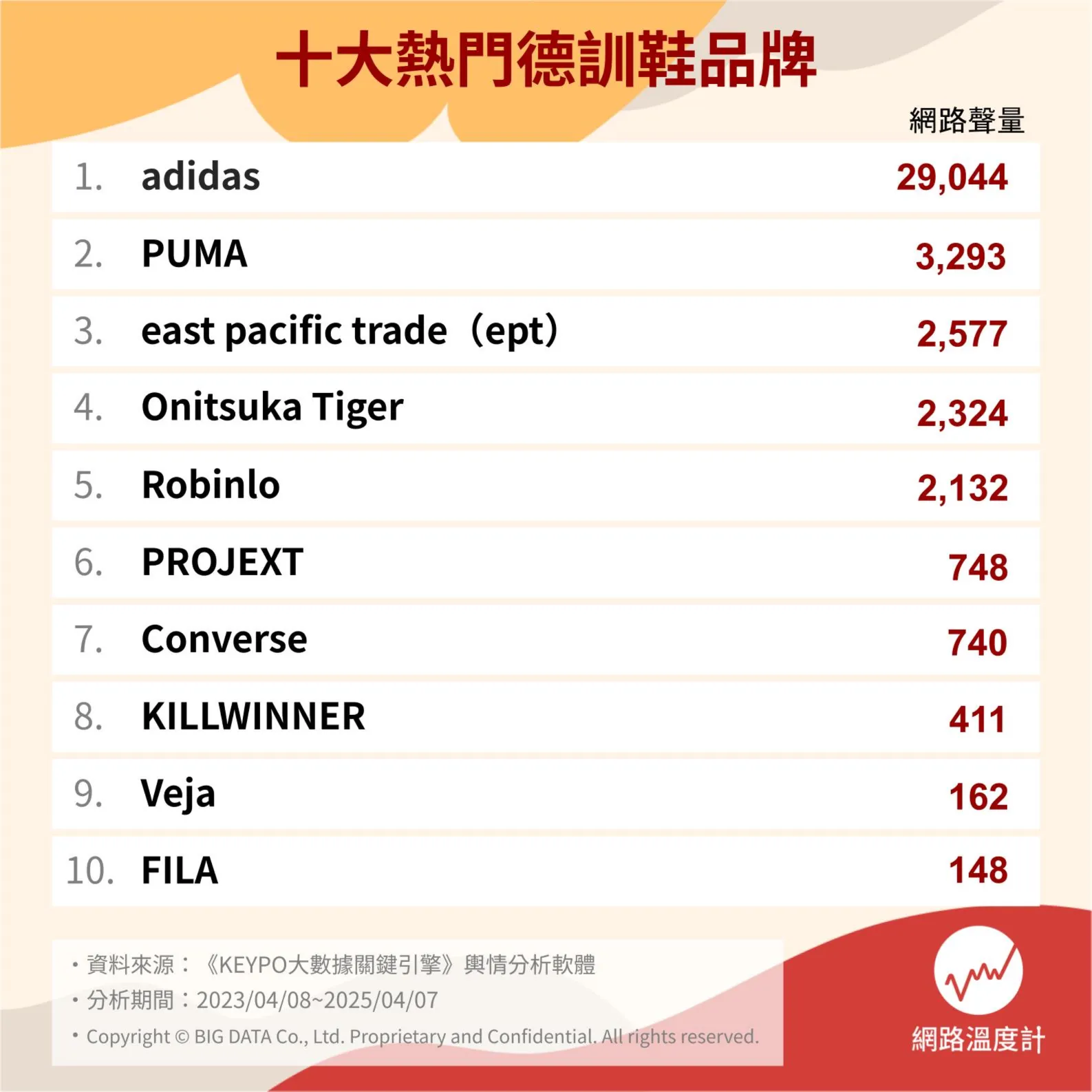 從運動界、軍事重地、伸展台一路紅到街頭,簡約百搭的德訓鞋永不退燒,不僅成為潮流經典標誌,更是征服MZ世代年輕人的復古風鞋款之一。《網路溫度計DailyView》透過《KEYPO大數據關鍵引擎》輿情分析軟體,盤點時下最熱門的十個德訓鞋品牌,並介紹當紅款式與搭配元素,讓你找到命定的那雙愛鞋!