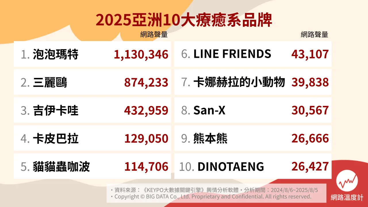 在現代快節奏且壓力沉重的生活中,人們長期面對工作競爭、經濟壓力與資訊轟炸,難免感到焦慮與疲憊。療癒系品牌正是在這樣的背景下受到青睞,透過可愛、溫暖或幽默的形象,為人們提供一種低成本、隨手可得的情緒慰藉。這些品牌不僅能讓人在視覺上獲得放鬆,更能在日常中創造情感連結,成為面對現實壓力的小確幸。《網路溫度計DailyView》透過《KEYPO大數據關鍵引擎》輿情分析軟體,盤點十大療癒系品牌,快來看這些小可愛你認不認識!