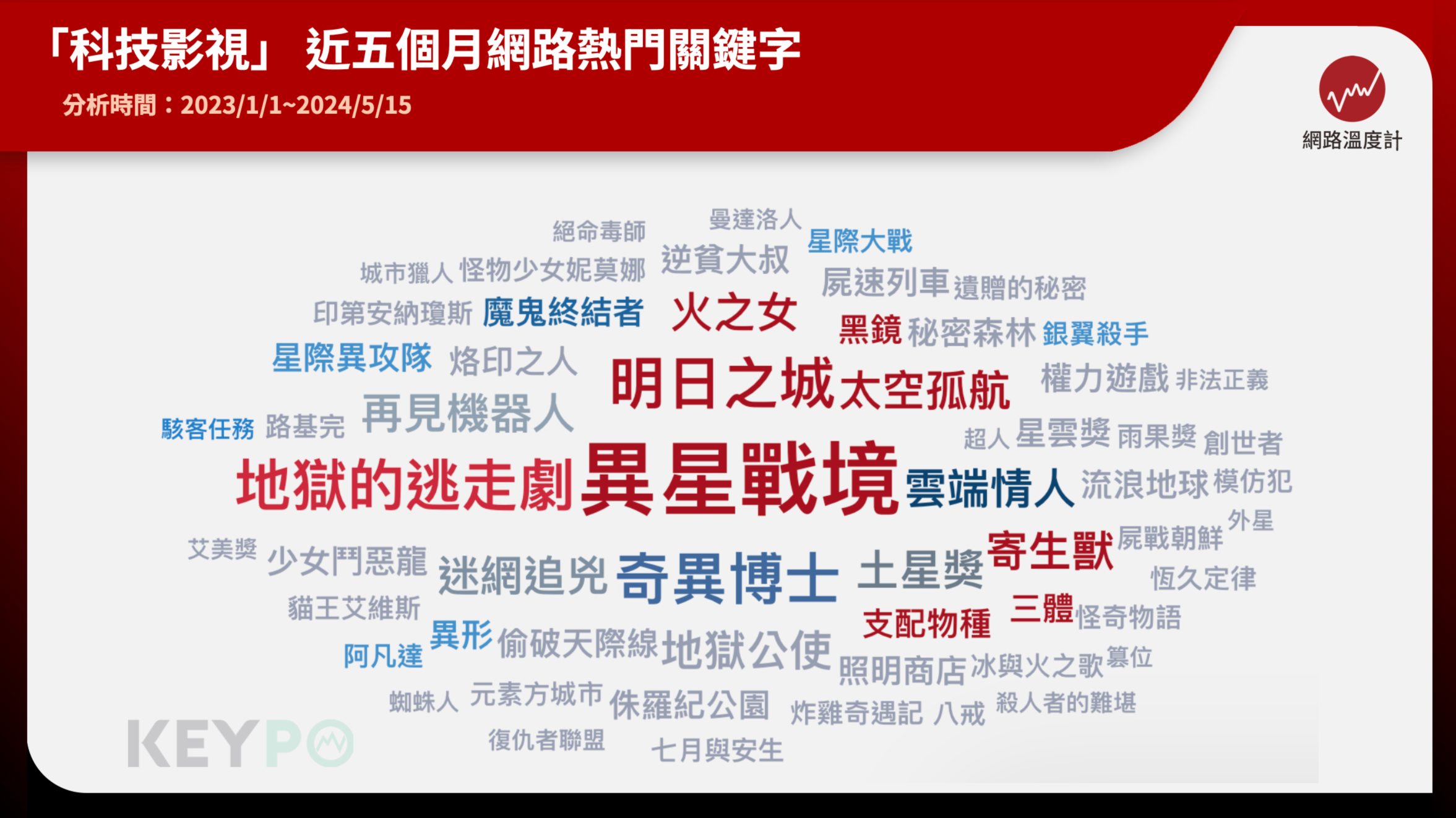 事實上,《網路溫度計》透過《 KEYPO大數據關鍵引擎 》輿情分析系統,觀察近五個月(2024/1/1-2024/5/15)關於「科幻影視作品」的網路聲量調查,從超過七萬筆資料裡找出的熱門關鍵字就會發現,上面提到的多部經典科幻/人工智慧題材相關的作品,都佔有一定地位,可以想見這些作品與話題在觀眾/網友心裡,都有著一定的份量。