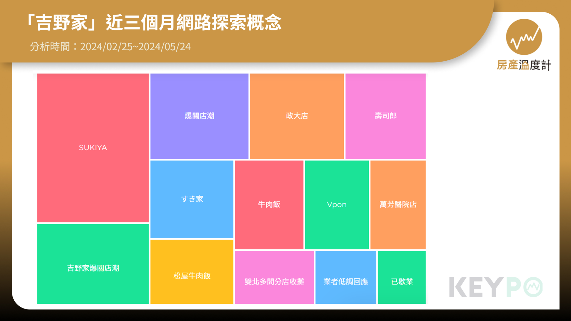 《房產溫度計》透過《KEYPO大數據關鍵引擎》輿情分析系統觀察近三個月(日期:2024/02/25~2024/05/24)「吉野家」的探索概念,出現了「SUKIYA、爆關店潮、已歇業、壽司郎、松屋牛肉飯」等字詞。隨著日幣持續貶值,許多民眾期望在台灣的日本商家能調降價格,不過吉野家、壽司郎、丸亀製麵等日系品牌紛紛表示並無降價規劃;四月時,吉野家與競爭對手松屋在日本聯手製造了愚人節驚喜,雙方在社群上共同發布對方產品的宣傳貼文,引發網友熱烈討論。