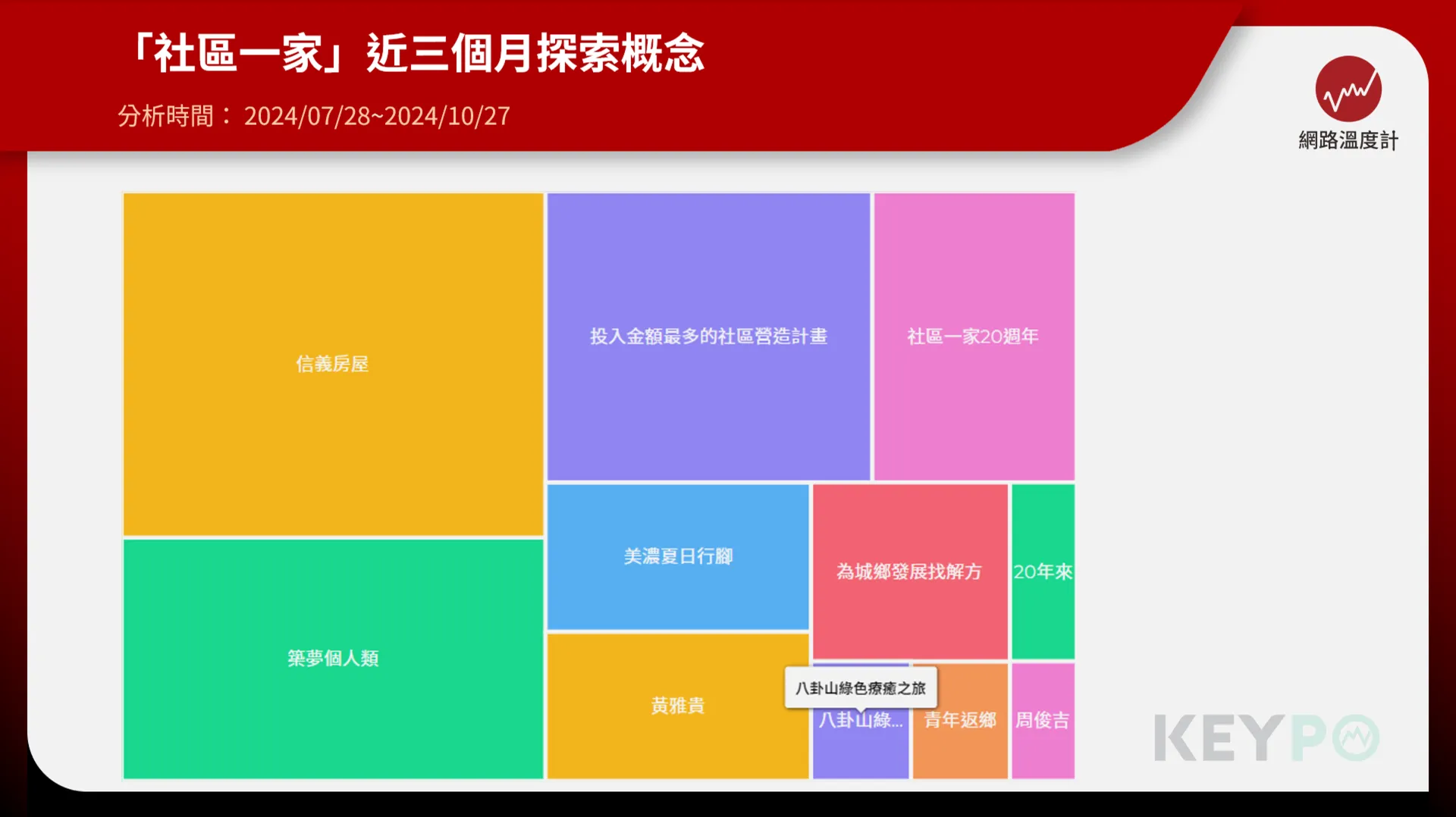 《網路溫度計DailyView》透過《KEYPO大數據關鍵引擎》輿情分析系統觀察近三個月(日期:2024/07/28~2024/10/27)「社區一家」的探索概念中出現了「信義房屋、社區一家20週年、周俊吉、返鄉青年、為城鄉發展找解方、美濃夏日行腳」等字詞。多年來,政府與民間攜手合作,為城鄉發展尋求解方,並吸引越來越多返鄉青年投入創業,用創意和熱情為家鄉注入新活力。例如,在信義房屋「社區一家20週年講座」中,特別邀請了宜蘭「美得冒泡」創辦人張台賜和彰化「鬆勢三日節」策展人劉孟豪,分享他們返鄉創業的成功故事。除此之外,信義房屋也以「美濃夏日行腳─濃time濃see」和「八卦山綠色療癒之旅」等小旅行活動,帶領民眾深入走訪當地,體驗與了解地方之美。