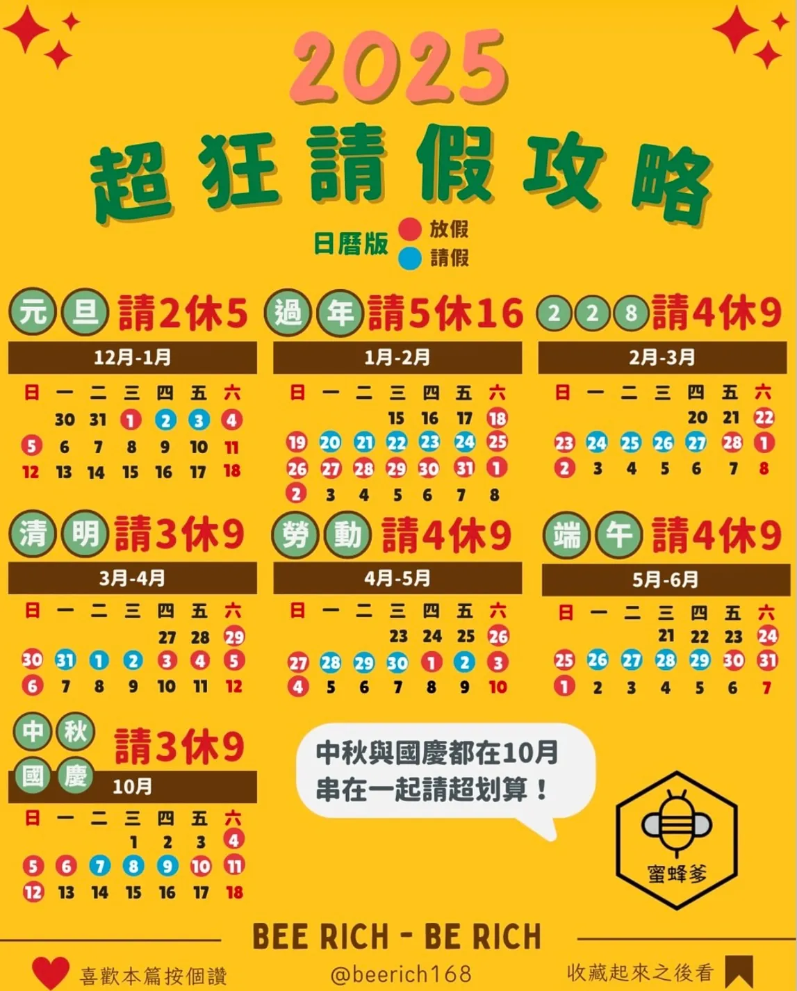 想出遊卻煩惱假期不足?網紅「蜜蜂爹」在社群平台Instagram發文分享「2025連假攻略」,貼心整理請假攻略,讓民眾能輕鬆延長假期,讓行程安排更盡興!其中元旦請假2日可連續休假5日,清明節、中秋X國慶請假3日可連續休假9日,甚至春節可請5日連續休假16日,相當於半個月不用上班。