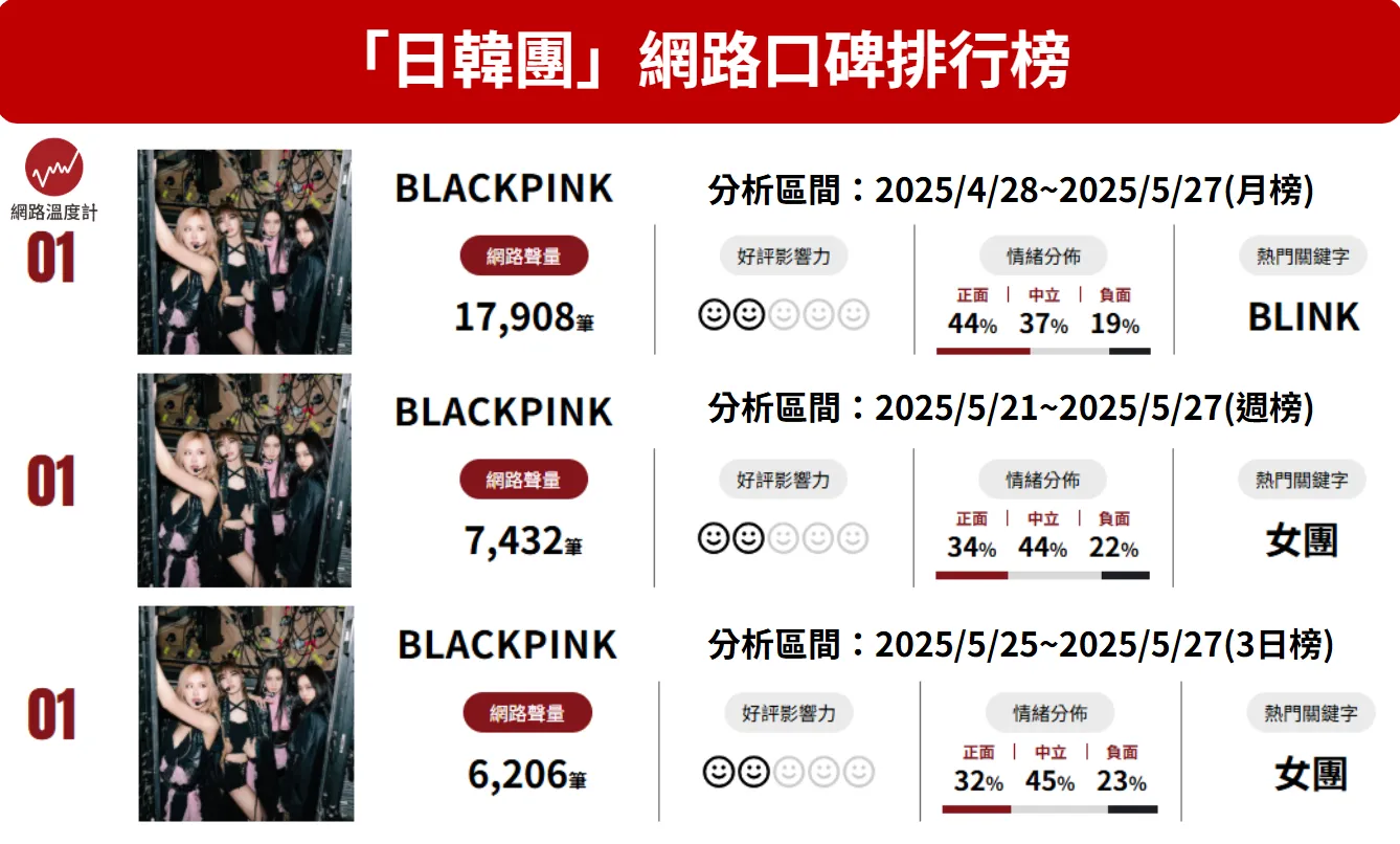 BLACKPINK魅力無法擋!她們高居《網路溫度計DailyView》「日韓團」口碑聲量月榜、週榜以及3日榜中的第一名。接下來的高雄演唱會不僅是世界巡迴亞洲場次的第一站,也寫下「史上首組女團,二度登上高雄世運舞台」壯舉。