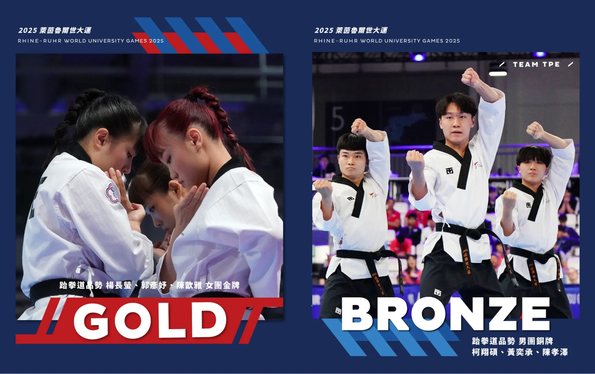 跆拳道品勢隊:女子團體賽由楊長螢、郭彥妤、陳歆雅以8.849分摘金,男子團體賽陳孝澤、黃奕承、柯翔碩也以8.866分拿下銅牌,品勢項目雙雙傳來捷報,為中華隊增添光彩。