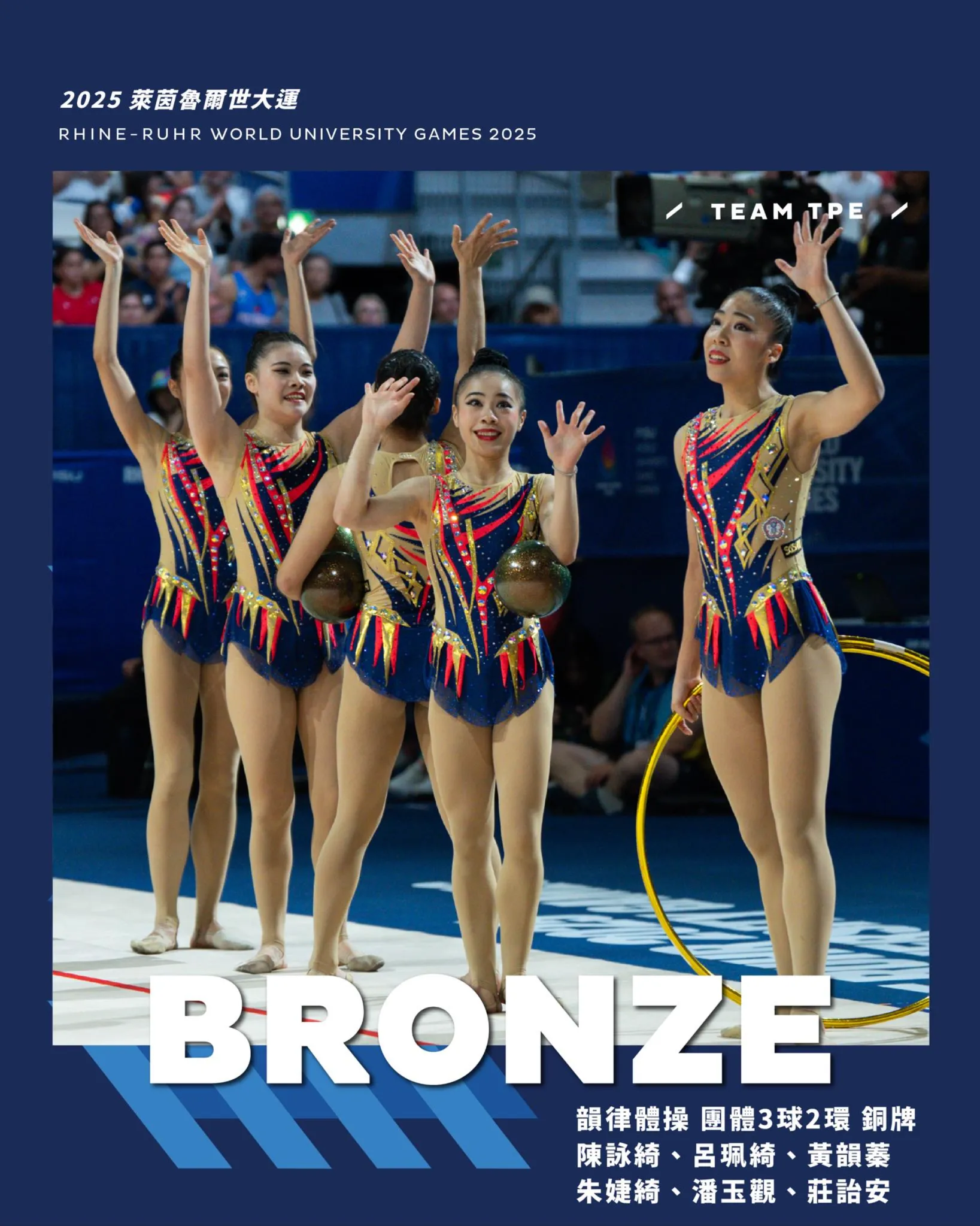 韻律體操隊:在團體3球2環項目中表現出色,成功奪下銅牌,這也是韻律體操隊連續兩屆在世大運奪銅,展現了團隊的穩定實力與堅持不懈的精神。