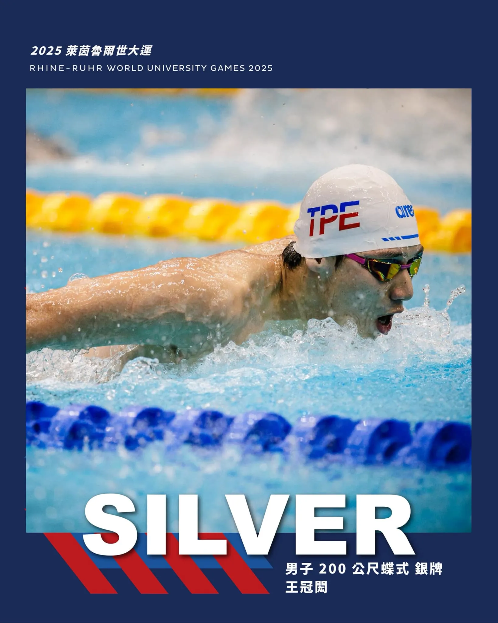王冠閎:在男子200公尺蝶式決賽中,展現精彩的後段加速,最終以1分55秒58的成績,連兩屆世大運摘下銀牌,實力穩定且持續精進。