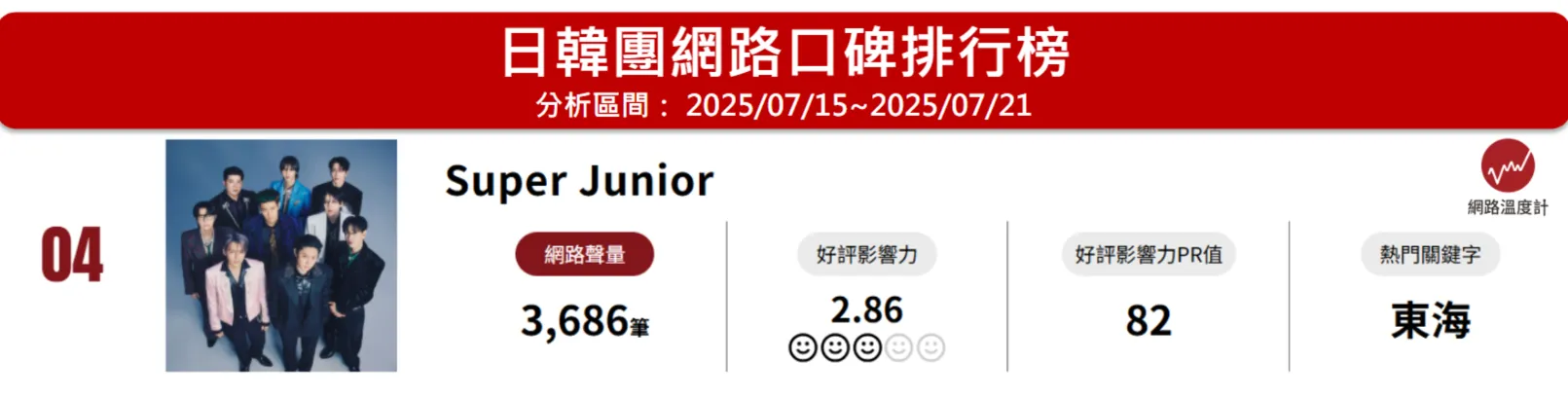 隨著官方陸續推出各種20週年活動,「Super Junior」在網路口碑榜「日韓團」週榜(2025/7/15~7/21)竄升第4名,好評影響力PR值則在200位進榜的日韓團中,獲得高達82的PR值。(註:好評影響力PR值意為顯示在同榜單內的相對排名,PR值越高代表排名越高。例如,PR值80,代表該項目勝過榜單內80%的其他人或品牌,位居前20%。)