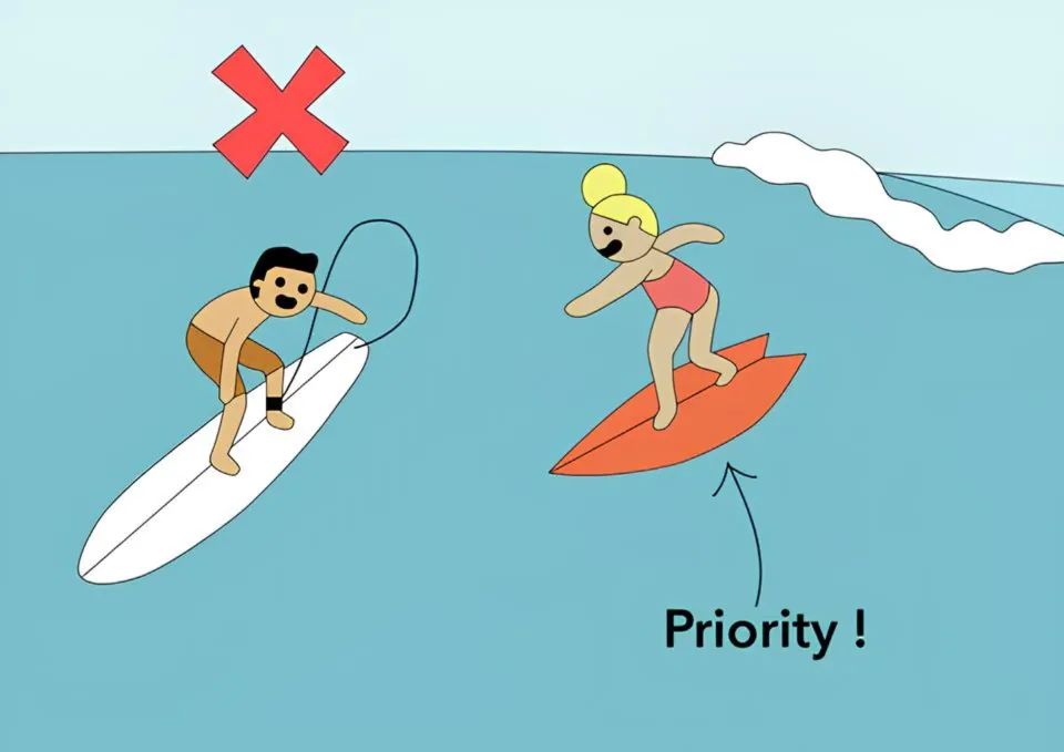 好享衝浪店主理人Henry整理了我們應遵守海上禮儀:千萬不要搶浪或偷別人的浪!簡單的說一人一道浪,越靠近浪頭的人就有優先權,如不小心發生搶浪或差點撞上他人,應立即道歉並確認對方是否受傷。另外我們向外滑水時應盡量避免擋到下浪者的移動路徑。最後記得海上活動永遠得綁住腳繩、避免丟板、理性溝通,才能玩得安全又開心。