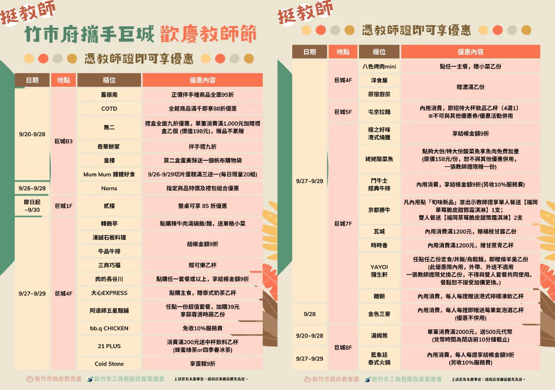 ▶ 優惠內容:憑教師證在巨城及大魯閣享有餐飲、購物與好禮等多重優惠。
