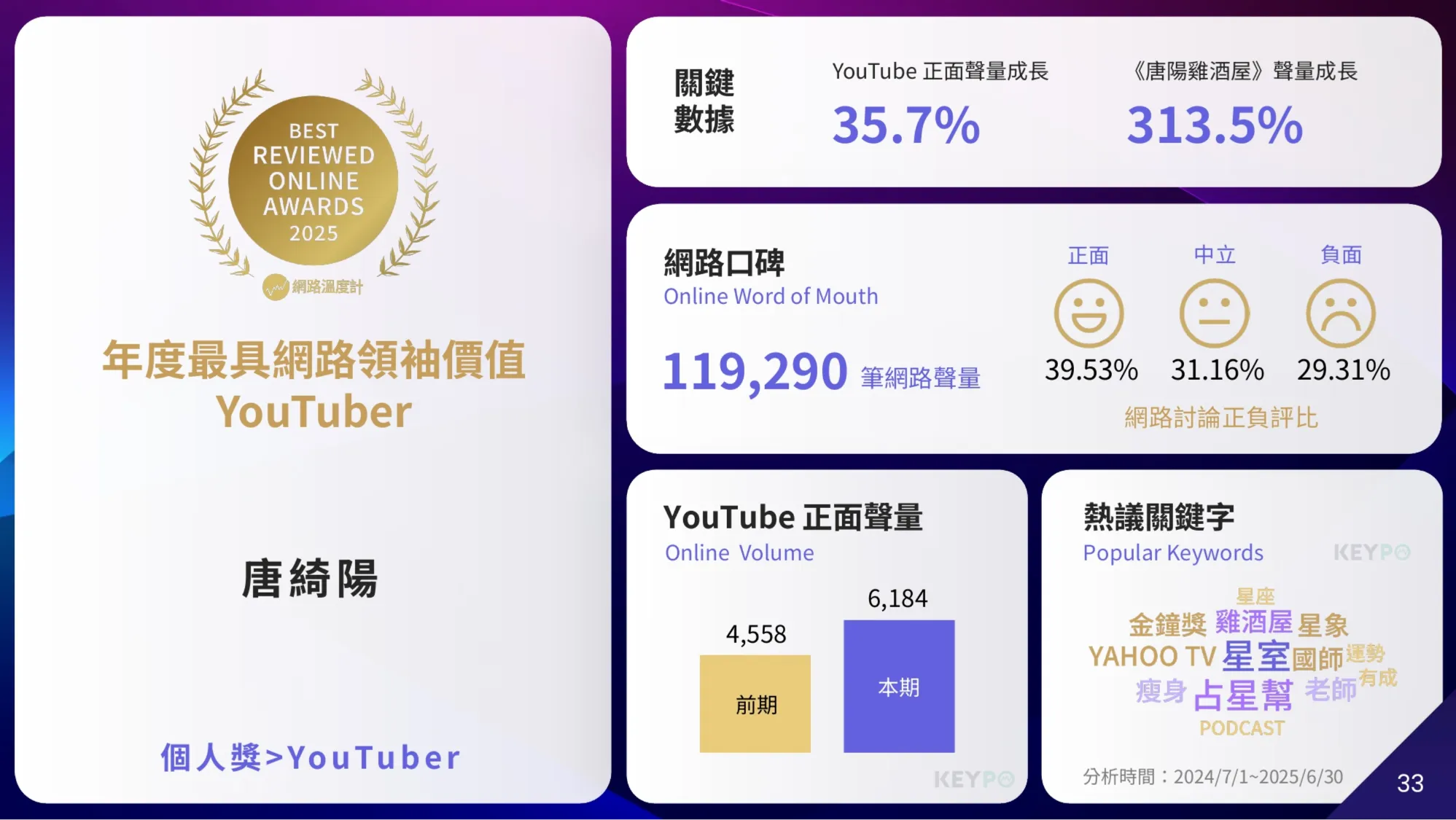 在AI世代的資訊洪流與情緒起伏交織之中,唐綺陽的影響力更加凸顯。根據《網路溫度計DailyView》統計,她在2024年7月至2025年6月間,累積119,290筆網路聲量,以強大的社群影響力拿下2025網路口碑之星「年度最具網路領袖價值YouTuber」。